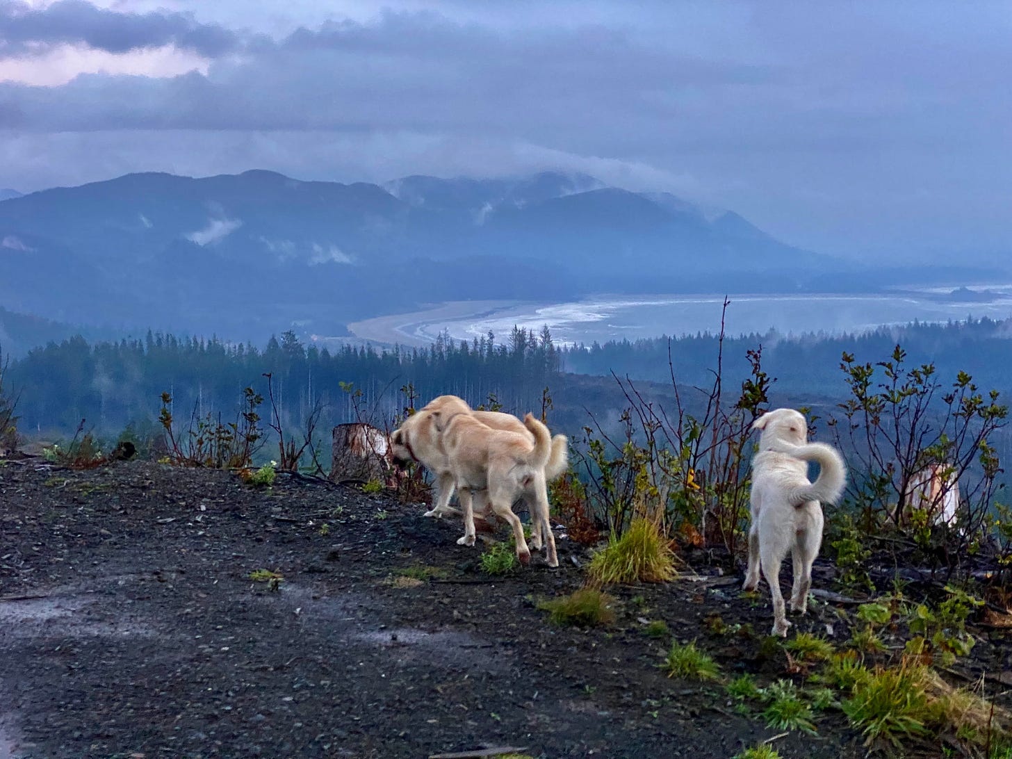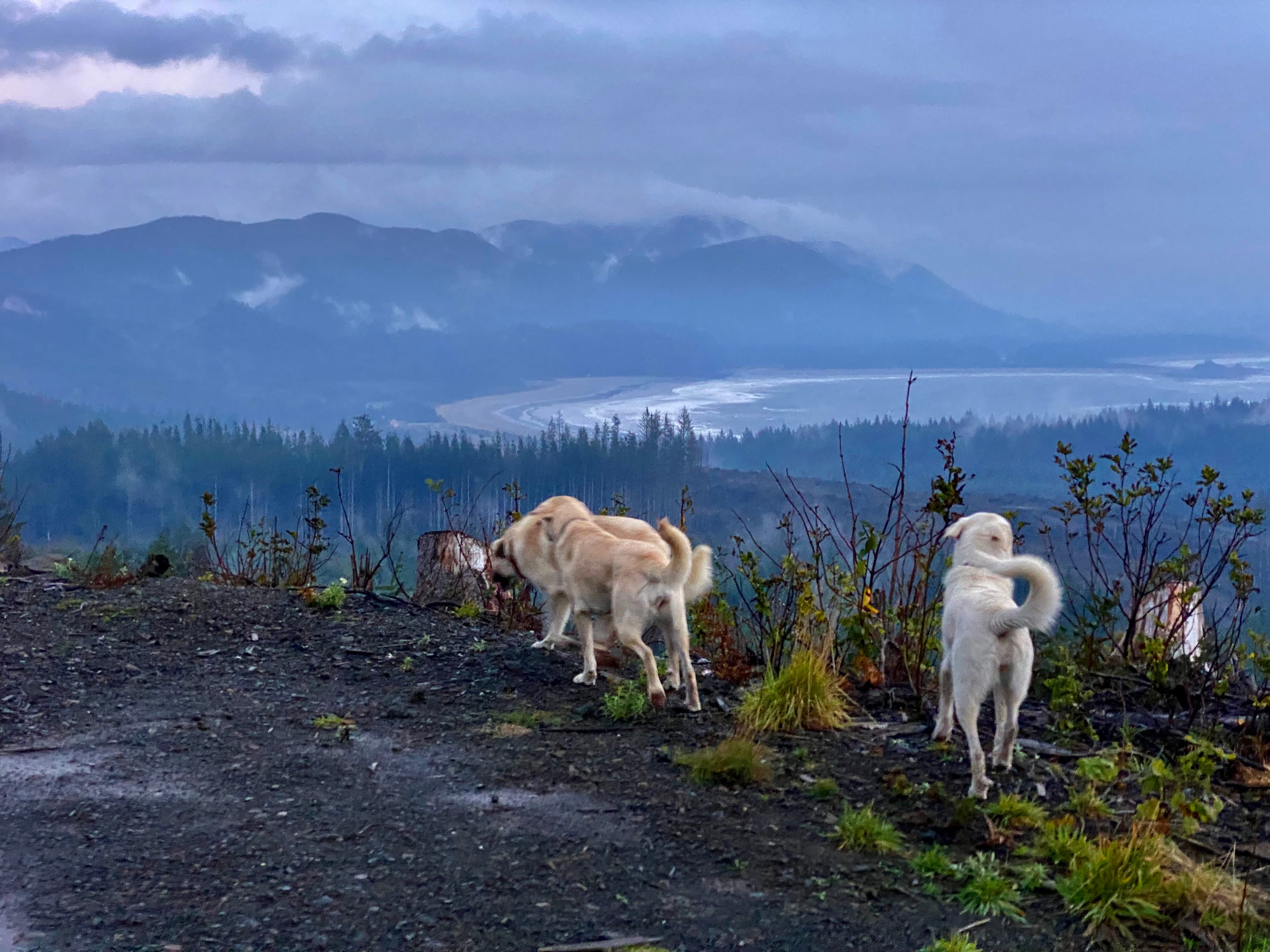 Why did we go to a clear cut? well, when you get up the road that wouldn’t exist if they didn’t cut all them trees, you can see the majestic view that you also couldn’t have seen unless somehow you hiked all the way up there and then climbed the right tree that now is a chunk of some house to the very tippy top. Plus if your dogs are like mine, which is well, mildly very extremely guardian breed type and quite young so they are as smart as a teenage boy with a 600hp supercharged hot rod and a pretty girl he thinks likes that kind of thing walking along the sidewalk. Yep, they may bite, he may blip the throttle and even lay some rubber. because all girls like that, mmhmm. and guardian dog yearlings guard sometimes a little too much. We need to see that theres nothing human for them to want to guard me from within sight so they and I can do our stroll in peace. so, top of the logged off I can see for miles we are alone! grr all the way up, all that pretty forest obliterated. sure is nice to see but so not nice to see. I mean, you get it. conflicted.